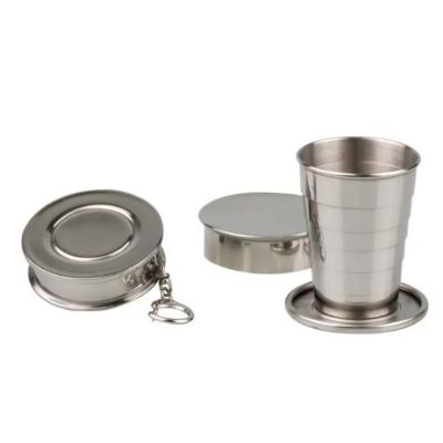 Teleskopisk drikkebeger av rustfritt stål. Perfekt tilbehør til din lommelerke. Sammenslått tar settet liten plass.